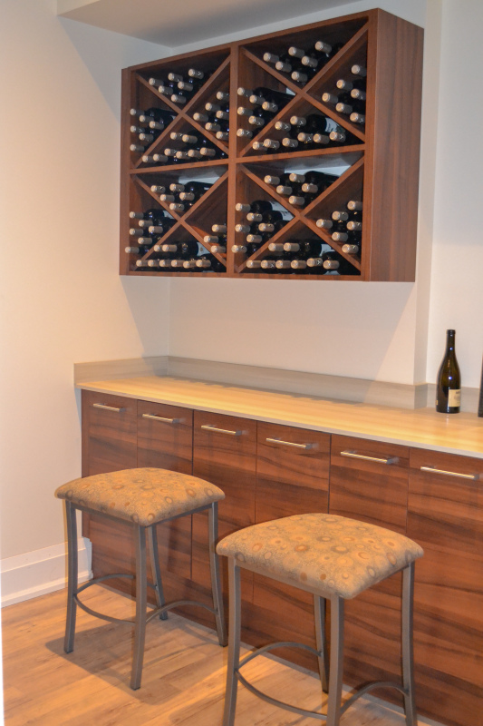 Our team got to work on a design that would allow for plenty of storage, while also leaving room for guests to gather and enjoy each other’s company. After the installation was completed, it’s safe to say that the space is an absolute showstopper! Featuring a gorgeous vanity that’s perfect for tucking away items and a marque wine rack, the space has everything a wine connoisseur could ever wish for!