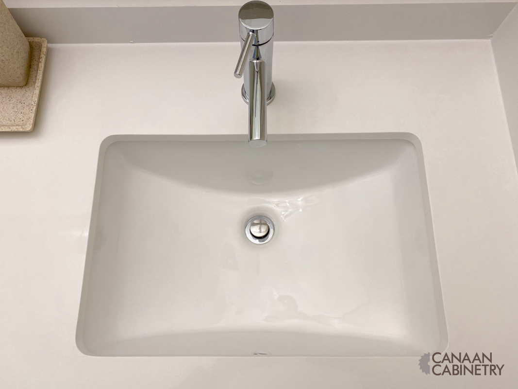 A fabulously durable design can be found with this bathroom vanity. Our client was in need of a vanity for one of their main floor bathrooms that could be used by guests. However, not only did it need to be durable and easy-to-clean, but it had to pack plenty of versatile storage space while meshing stylishly with the surrounding area. Once the design was complete and the vanity manufactured, our team installed the vanity.