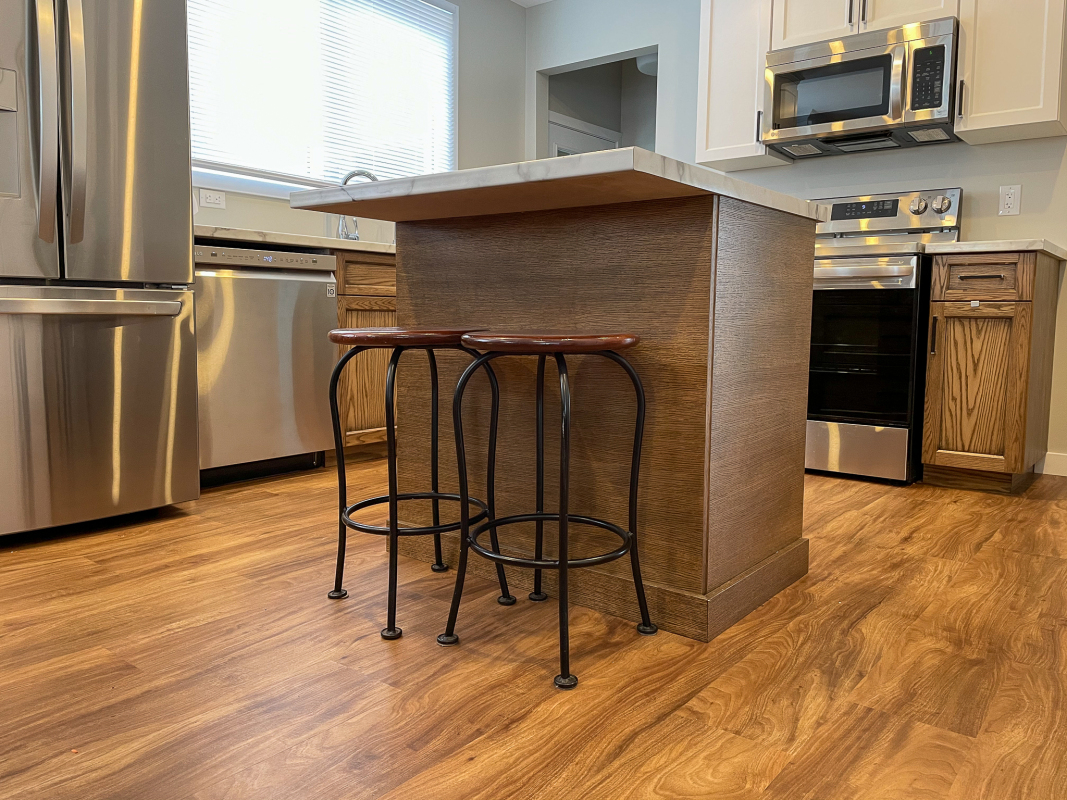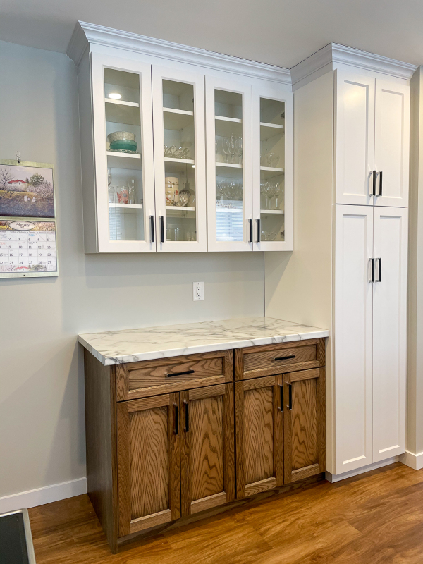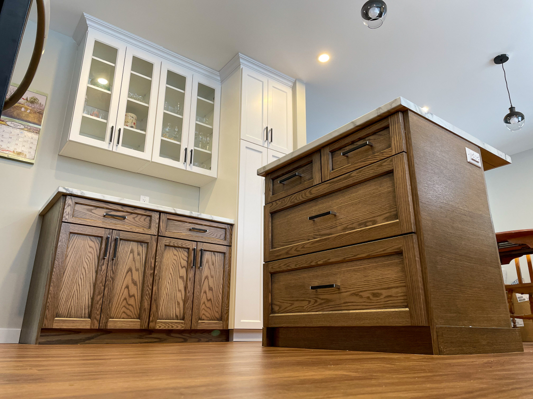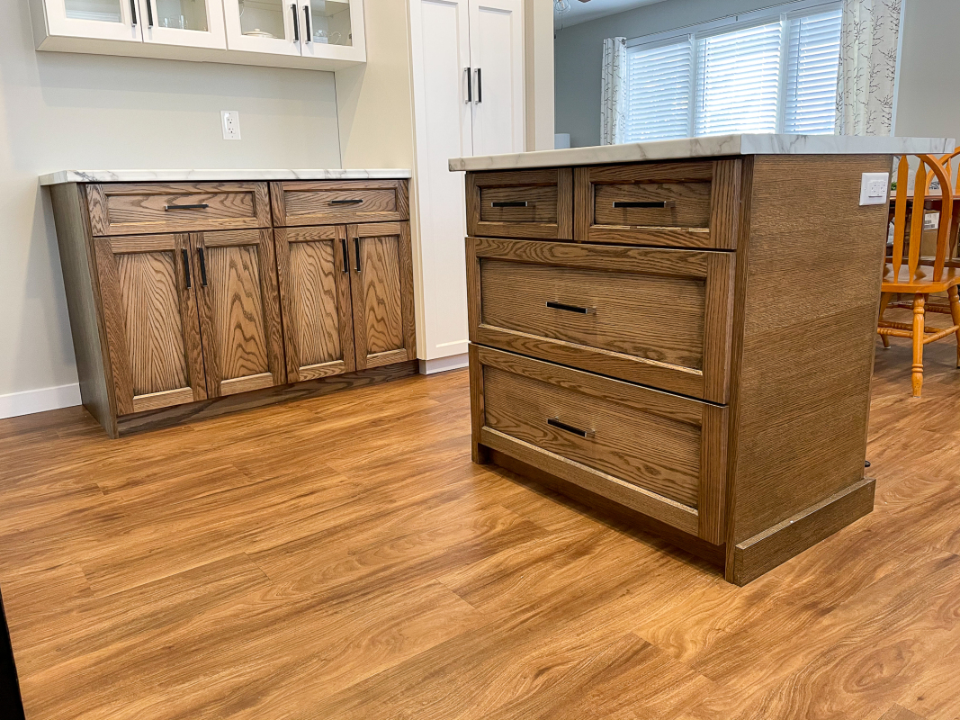 In this kitchen, this contrast was achieved by using a shaker bevel styled door for the upper cabinetry that’s perfected with a stunningly sleek, arctic white finish. For the lowers, concord styled, distressed oak doors add the appropriate level of contrast that is perfectly tied in with a Calcutta laminate countertop from our friends at Empire Countertops. The end result? A kitchen that instils traditional elements with just the right blend of modern sophistication.