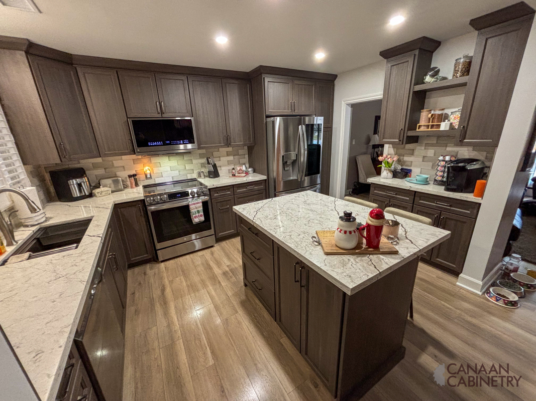 To make the most of the available area, we extended the upper cabinetry to the ceiling, finished with a 4” cove crown for a refined appearance. This kitchen was designed with efficiency and versatility in mind, creating a beautiful and practical space for everyday use.